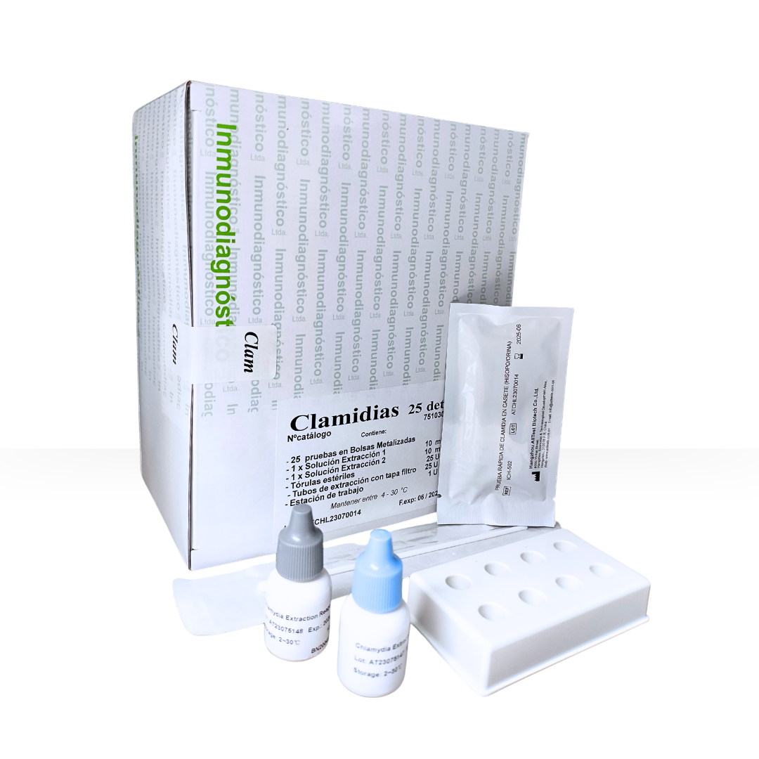 Prueba inmunocromatográfica para la detección cualitativa del antígeno lipopolisacárido de Clamydia trachomatis en muestras de secreción endocervical femenina, secreción uretral masculina y de orina masculina. Incluye tórulas. Certificado por ISP.